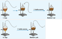 Louis Pasteur, görseldeki gibi kontrollü bir deney düzeneği hazırladı. Birbirinin tamamen aynı olan kaplar içine et suyu koyarak bunlara kuğu boynu şeklinde birer boru taktı. Bu boru sayesinde içeriye hava girişi sağlanırken toz ve kirin girmesi engellenmiş oldu. Kapların ikisini de ısıtarak steril bir ortam oluşturdu. Daha sonra kaplardan birinin boynunu kırarak hava ile doğrudan temas edebilmesini sağladı. Diğer kabı ise aynen bıraktı. İlk kapta bakteri oluşumu gözlendi ancak ikinci kapta hiçbir canlı oluşmadı.