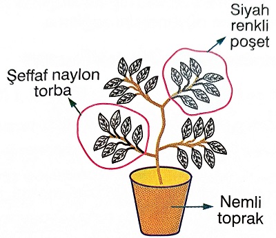 Bu deneyde, bir bitkinin iki dalı: Biri şeffaf naylon torba ile, Diğeri siyah renkli poşet ile kapatılmıştır. Amaç: Işığın fotosentez ve terleme üzerindeki etkisini gözlemlemek.