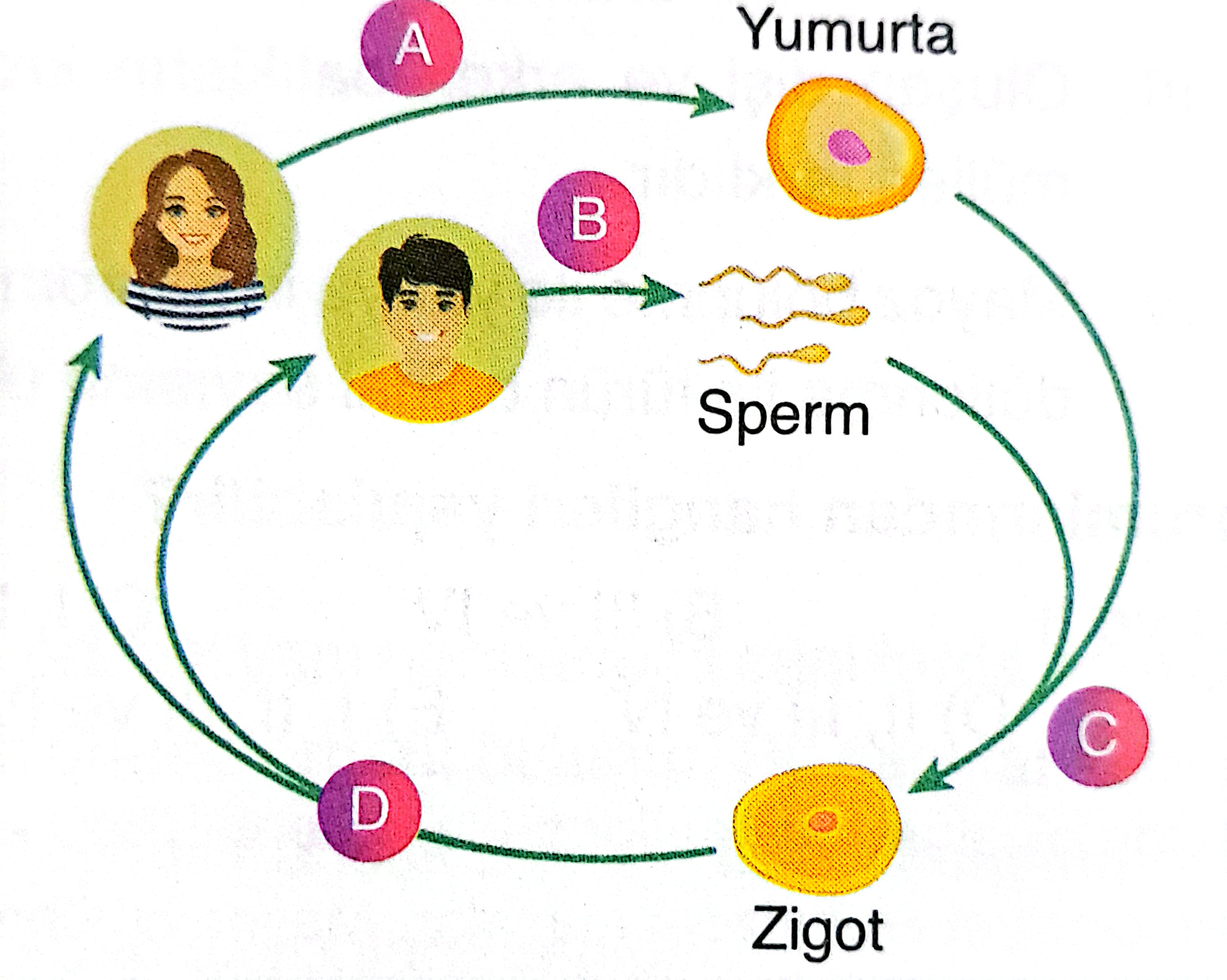 İnsanda eşeyli üreme ile ilgili basamaklar şekilde harflerle belirtilmiştir. Buna göre harflerle belirtilen basamakların neler olduğunu yazınız.