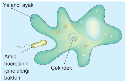 Amip, besin olarak bir bakteriyi fagositozla hücreye aldıktan sonra sindirim işlemini başlatır. Sindirim sonucu açığa çıkan molekülleri kullanarak enerjiyi elde eder. Enerjiyi kullanarak hareket eder ve bölünür.