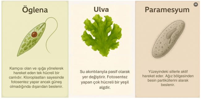 Elif, tatlı su birikintisinden aldığı bir örneği mikroskopta incelerken tek hücreli, kontraktil kofulu, kloroplastlı ve kamçılı bir organizma görür. Bu organizma, hem fotosentez yaparak beslenir hem de gerektiğinde dışarıdan hazır besinleri alarak heterotrof beslenme yapar.