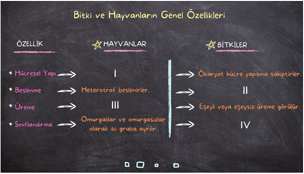 Bir biyoloji öğretmeni, bitkiler ve hayvanlar âlemlerine ait genel özellikler ile ilgili bir karşılaştırma tablosu hazırlayarak tahtaya yazmıştır. Bu karşılaştırma tablosunda bazı özellikleri boş bırakıp numaralandırmış ve öğrencilerin bu boş bırakılan yerleri uygun özellikler ile doldurmalarını istemiştir.