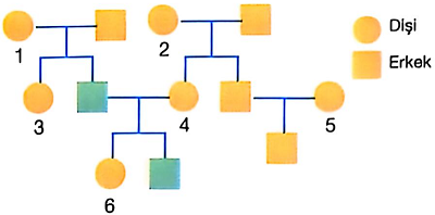 Renk körlüğü X kromozomu üzerinde çekinik genle taşınan bir özelliktir. Aşağıdaki soyağacında renk körü bireyler koyu renkle gösterilmiştir.