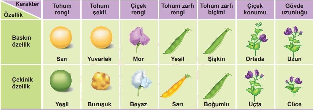 Aşağıdaki tabloda Mendel’in çalışma yaptığı bezelyelerde gözlemleyebildiği karakterler ve özellikler verilmiştir.