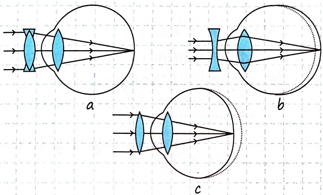 Aşağıdaki şekillerde farklı çeşitte mercekler kullanılarak giderilen göz kusurları gösterilmektedir.