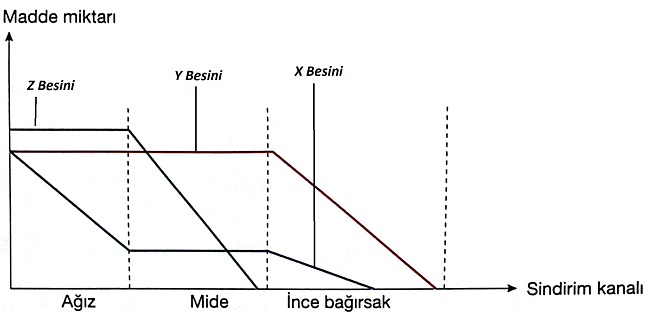 Aşağıdaki grafikte X, Y, Z besin maddelerinin sindirim kanalın bölümlerindeki miktar değişimi verilmiştir.