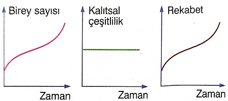 Bu grafiklerde üç farklı değişkenin zamanla değişimi gösterilmiştir: 1. Birey sayısı artıyor. 2. Kalıtsal çeşitlilik sabit kalıyor. 3. Rekabet artıyor.