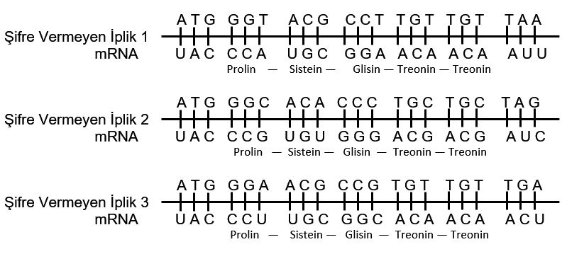 Sentezlenecek protein çeşidi ile ilgili şifre veren DNA ipliklerinin dizilimlerinin aşağıdaki şekilde olduğu belirtilmiştir.