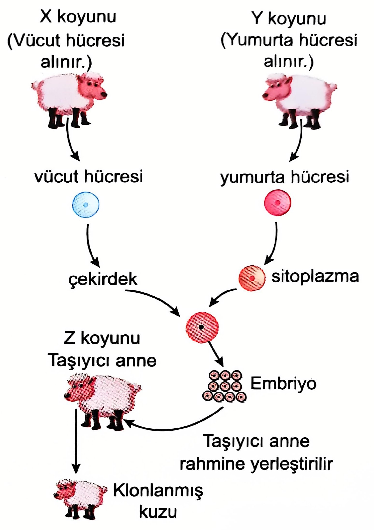 Şekilde bir koyunun klonlanma süreci detaylı bir şekilde gösterilmiştir. Öğretmen, klonlama işleminin genetik yapı üzerindeki etkilerini ve farklı bireylerden alınan hücrelerin rollerini tartışmaya açmıştır. Bunun üzerine öğrencilerden klonlanmış kuzunun genetik özellikleri ve yaşam süresi ile ilgili yorum yapmaları istenmiştir.
