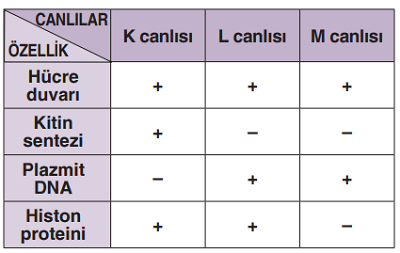 Aşağıdaki tabloda K, L ve M canlılarına ait bazı özellikler verilmiştir.