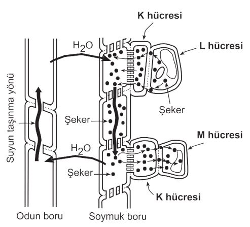 Yukarıdaki şekil, çiçekli bitkilerde iletim borularıyla şeker ve su taşınmasını göstermektedir.