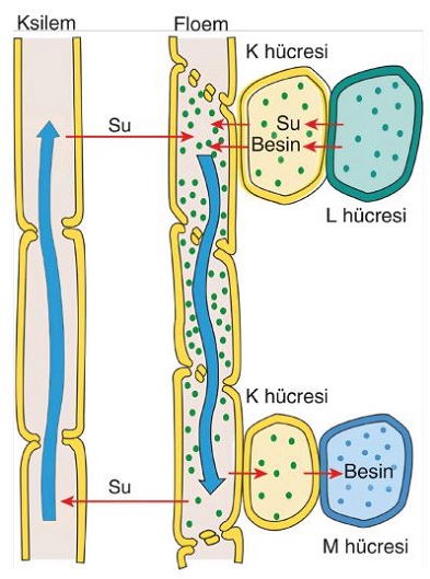 Çiçekli bitkilerde su ve besin maddelerinin basınç akış teorisine göre taşınması aşağıdaki şekilde gösterilmiştir.