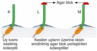 Karanlık bir ortamda özdeş K, L ve M koleoptilleri ile gerçekleştirilen deney aşağıda gösterilmiştir. Deneyde üç koleoptilin de uç kısımları kesilmiş ve eşit miktarda oksin emdirilmiş agar bloklar L ve M koleoptillerine şekildeki gibi yerleştirilmiştir.