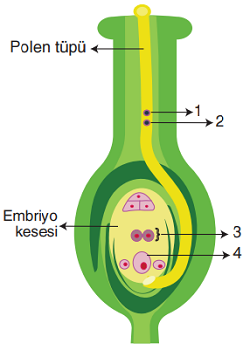 Kapalı tohumlu bir bitkide polen tüpünde ve tohum taslağında yer alan bazı çekirdekler numaralandırılarak aşağıdaki şekilde gösterilmiştir.