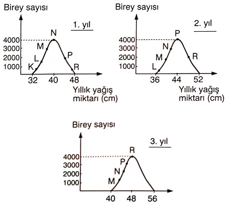 Aşağıdaki grafikler, yıllık yağış ortalamalarında farklılıklar saptanan bir ekosistemde, bir bitki popülasyonunun K, L, M, N, P ve R varyasyonlarının 1, 2 ve 3.yıllardaki dağılımını göstermektedir.