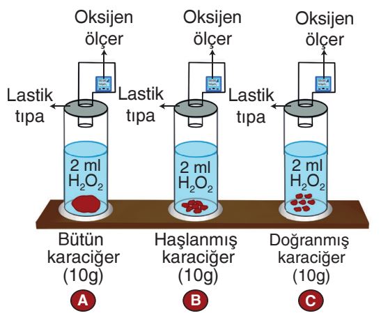 Üç ayrı deney tüpünde sıcaklıkları ve kütleleri eşit olan karaciğer örnekleri üzerine eşit hacimde H2O2 eklenerek aşağıda gösterildiği gibi bir deney düzeneği hazırlanmıştır. Tüplerde açığa çıkan oksijen miktarı deney süresince ölçülerek gözlem yapılmıştır.