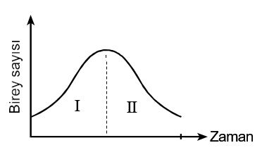 Bir populasyonun birey sayısı, yukarıdaki büyüme eğrisinde görüldüğü gibi, I.zaman aralığında artmış, II.zaman aralığında azalmıştır.