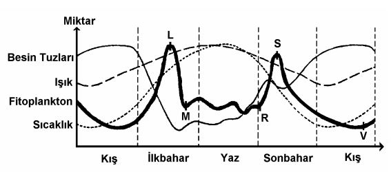 Aşağıdaki grafikte, bir gölde, ışık, sıcaklık, besin tuzları miktarı ve fitoplankton yoğunluğunda mevsimlere göre gerçekleşen değişmeler gösterilmektedir.