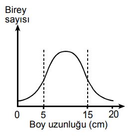 Yukarıdaki grafik, bir ekosistemde bulunan bir bitki populasyonundaki bireylerin boy uzunluğuyla ilgili dağılımını göstermektedir. Belirli bir süre sonra, bu populasyonda boyu 5 cm nin altında ve boyu 15 cm nin üzerinde olan bireyler, ekosistem koşullarına bağlı olarak ayıklanmıştır.