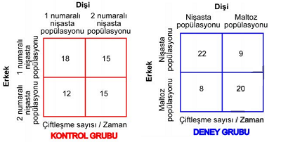 Bir deneyde, bir meyve sineği popülasyonu iki gruba ayrılıp nişastalı ve maltozlu besin ortamında 50 kuşak yetiştiriliyor. Farklı besin ortamlarına uyum sağlamış bu gruplara ait bireyler, daha sonra aynı ortamda bir araya getirildiğinde tabloda verilen çiftleşme sayıları elde ediliyor.