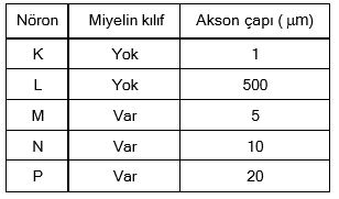 Aşağıdaki tabloda çeşitli hayvan gruplarına ait K, L, M, N ve P olarak adlandırılan nöronların bazı özellikleri verilmiştir.