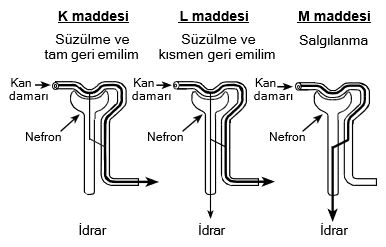 Normal bir insanda K, L ve M olarak adlandırılan üç madde ile ilgili olarak nefronda gerçekleşen bazı olaylar aşağıdaki şekilde gösterilmiştir.
