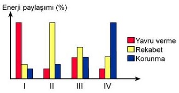 Aşağıdaki grafikte, bir canlının net enerjisinin, çeşitli koşullarda üç önemli etkinlik (yavru verme, rekabet, korunma) arasındaki paylaşımı verilmiştir.