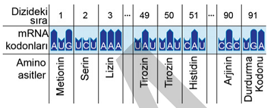 Aşağıda bir ökaryotik hücrede 90 amino asitten oluşan bir polipeptidin sentezlenmesine esas teşkil eden bazı mRNA kodonları ve bunlara karşılık gelen amino asitlerin sırası verilmiştir.