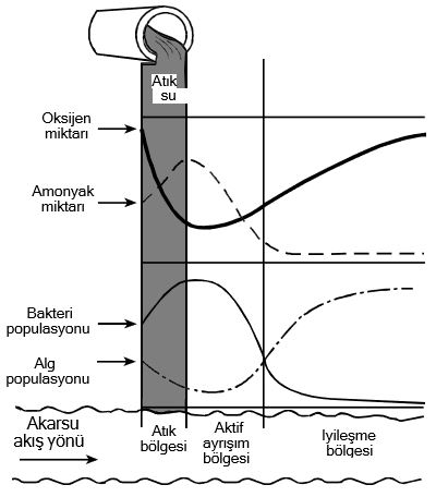 Aşağıdaki grafik, atık su boşaltılan bir akarsu ortamında, atığın boşaltıldığı atık bölgesinden iyileşme bölgesine doğru gidildikçe, oksijen ve amonyak miktarları ile bakteri ve alg populasyonlarında meydana gelen değişiklikleri göstermektedir.