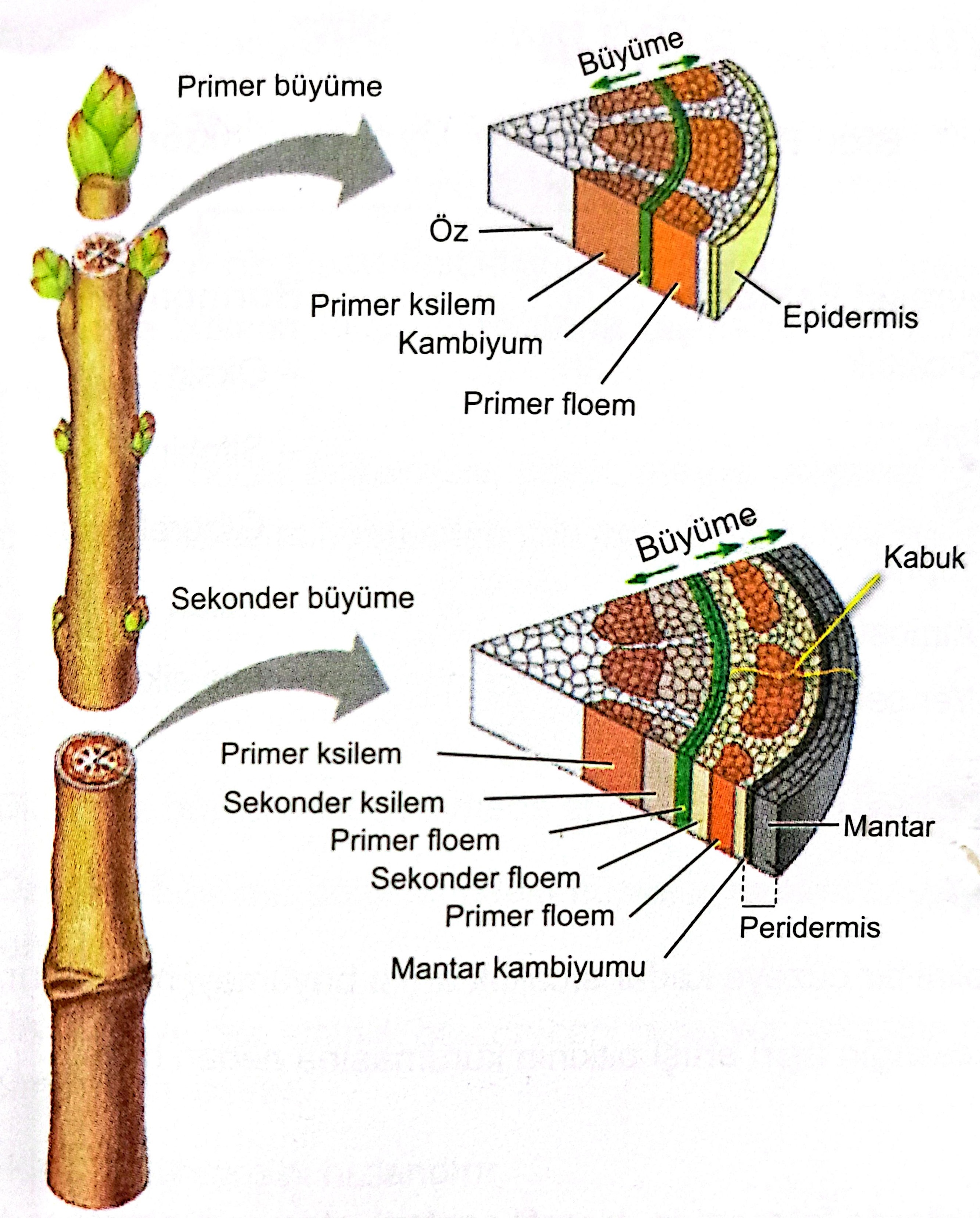 3. Gövde ucunda bulunan Tepe Tomurcuğu sayesinde gövde boyuna uzar. Burada uç meristem hücreleri bulunur. Tepe tomurcuğu koruyucu pullarla korunur. İlkbaharda tepe tomurcuğunu koruyan pullar dökülür, yeni bir primer büyüme başlar. Tepe tomurcuğu bir yıl büyüdükten sonra tekrar koruyucu pullarla kaplanır. Bitkinin boyca uzaması güneş ışığından daha çok faydalanmasını sağlar.