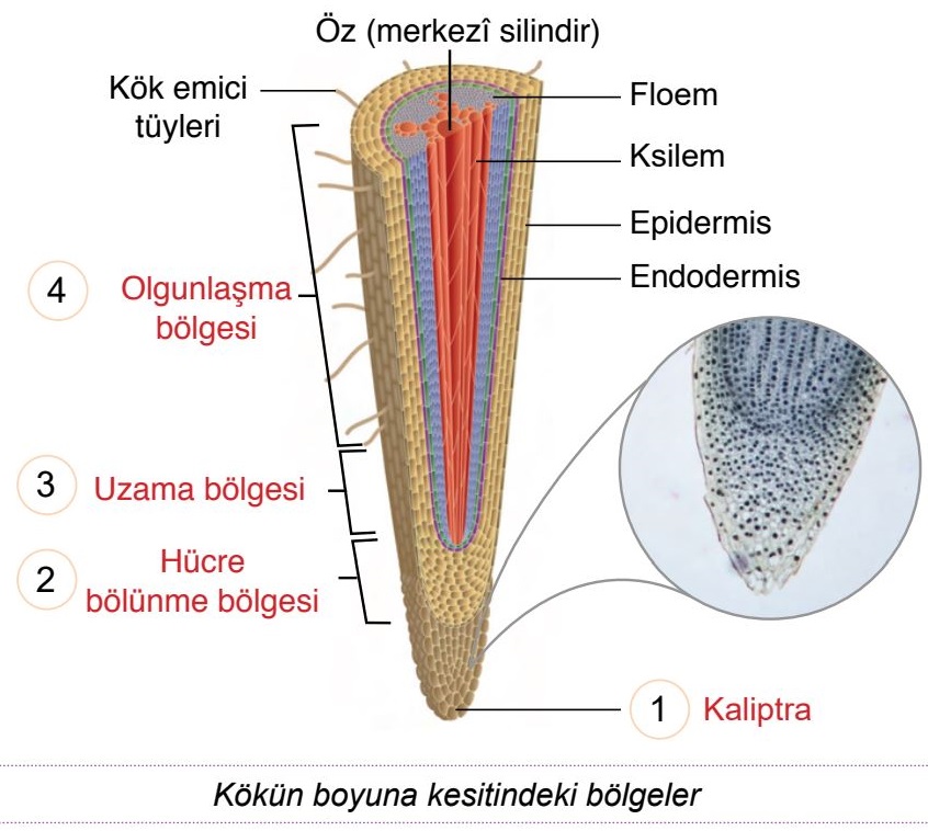5. Merkezi Silindir: İletim demetlerini (ksilem ve floem) taşıyan bölümdür. Merkezi silindirde; iletim demetlerinin dizilişi tek ve çift çenekli bitkilerde farklıdır. Tek çenekli bitki kökünde kapalı iletim demeti, çift çenekli bitki kökünde ise açık iletim demeti bulunur.