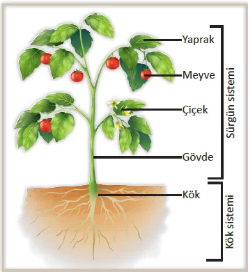 ► Kök; bitkinin kök sistemi içinde yer alırken gövde ve yapraklar sürgün sistemi içinde yer alır.