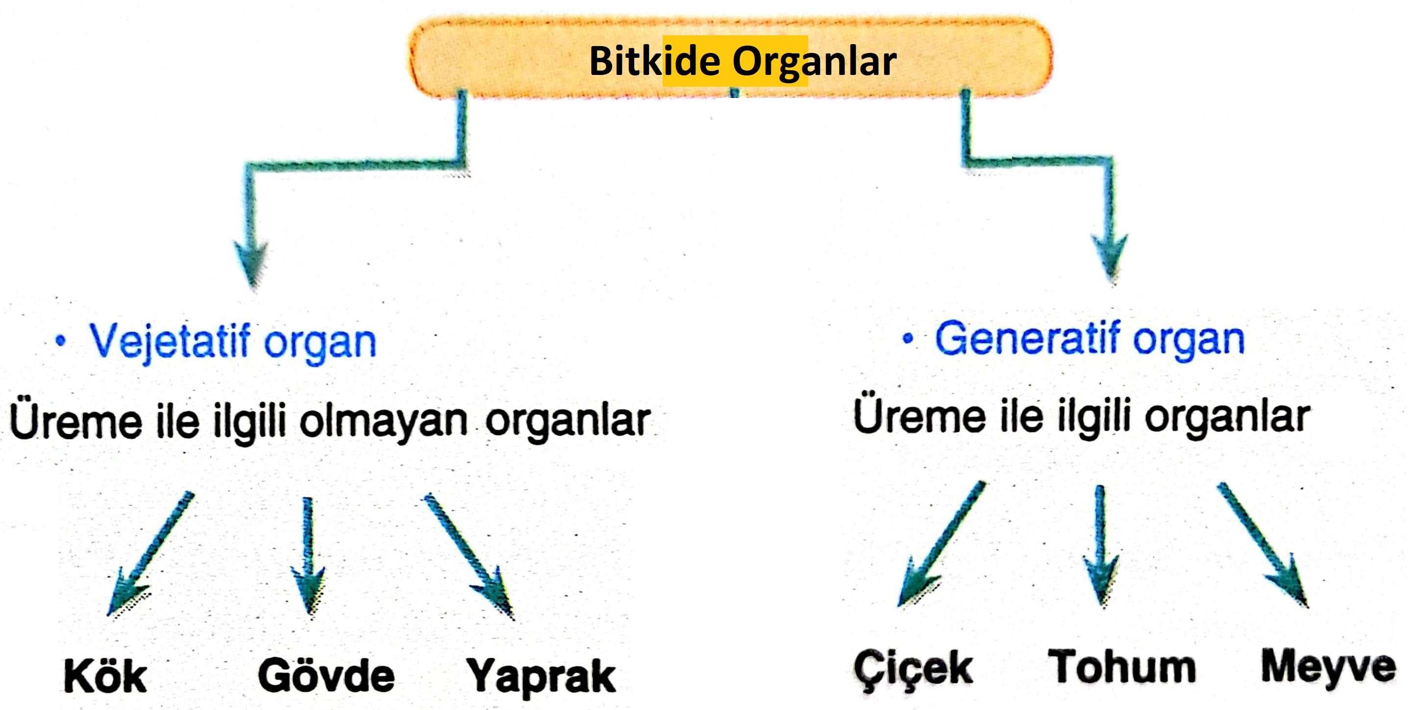► Bitkiler temelde kök, gövde ve yapraklar olmak üzere üç organa sahiptir. Bunların dışında; eşeyli üremeden sorumlu çiçek, tohum ve meyve gibi yapılar da taşırlar.