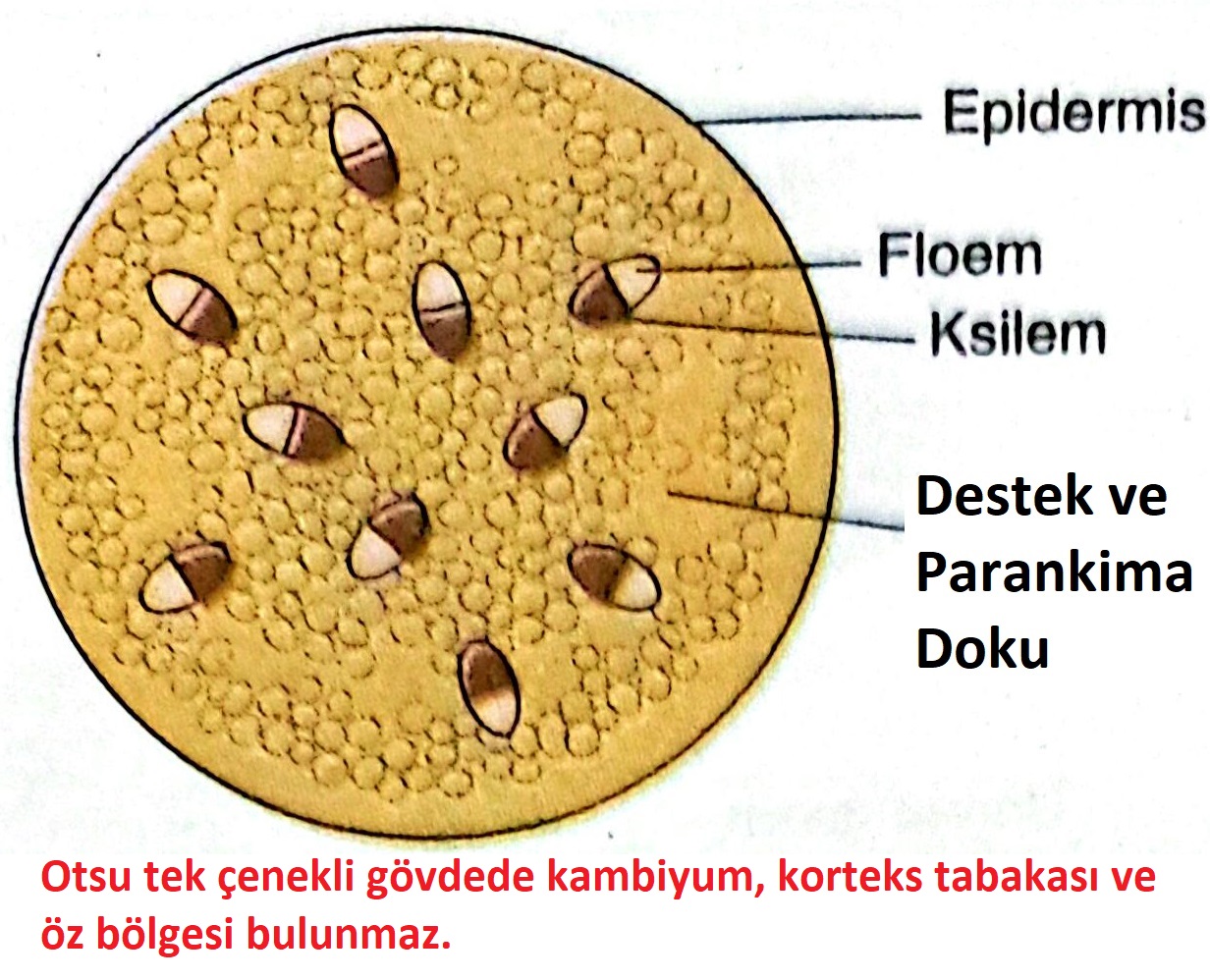 | Ksilem; kökün merkezinde yıldız şeklindedir. Floem; ksilemin yıldız şeklindeki kolları arasında yerleşmiştir. Kambiyumun bölünen hücreleri merkeze doğru ksilemi, çevreye doğru floemi oluşturur. | İletim demetleri (merkezi silindirde) düzensiz olarak dağılmıştır. (Kambiyum bulunmadığı için) Ksilem ve floem öz bölgesinin etrafına dizilmiştir. |