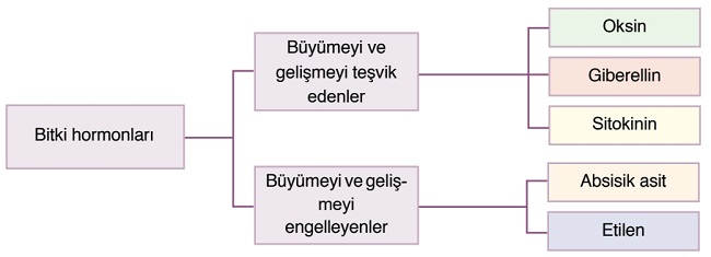 Bu hormonlardan oksin, sitokinin ve giberellin hormonları büyümeyi teşvik ederken; etilen ve absisik asit, büyümeyi engeller.