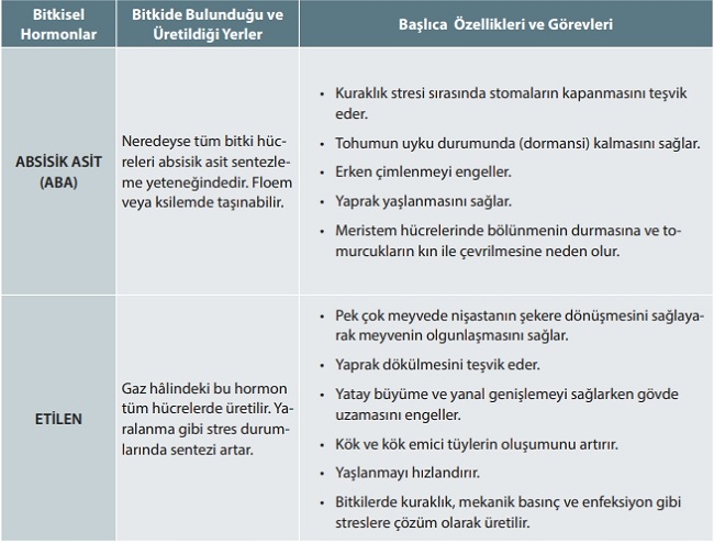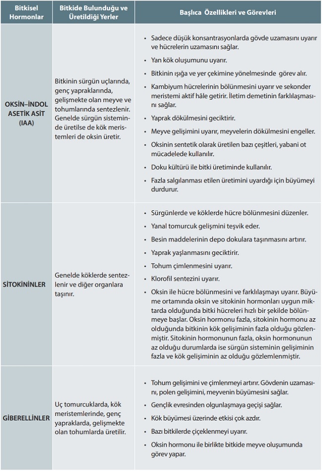 ► Bitkilerde; çimlenme, hücre bölünmesi, büyüme ve gelişme, çiçek açma, meyve oluşumu, yaprak dökümü, stomaların açılıp kapanması, bitkinin ışığın geldiği tarafa doğru yönelmesi, yaprak ve çiçeklerin solması ve yaşlanması, yaprak dökümü, tohum ve tomurcukların uyku hâlinde kalması, bitkinin kış koşullarına uyum sağlaması gibi olaylar hormonlarla kontrol edilir.