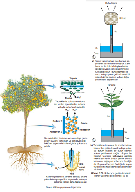 - Transpirasyon-Çekim Teorisi: Yapraklardaki stomaların açılmasıyla su buharı dışarı çıkar ve bu olay transpirasyon olarak adlandırılır. Transpirasyon suyun ksilem boyunca yukarı çekilmesini sağlar.