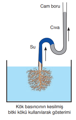 - Kök Basıncı: Topraktan suyun kök hücrelerine osmoz yoluyla alınması sonucu oluşan basınç, suyu ksilem boyunca yukarı doğru iter.