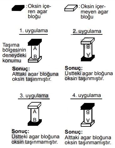 5439Bitkilerde tepe tomurcuğunda üretilen oksin (büyüme hormonu), bitkinin alt bölümlerine, tepe tomurcuğunun hemen altındaki taşıma bölgesiyle iletilir. Düzenlenen bir deneyde aynı bitkiden dört taşıma bölgesi kesilerek çıkarılmıştır. Deneydeki 1. ve 3. uygulamalarda kullanılan taşıma bölgeleri, bitkideki konumunda; 2. ve 4. uygulamalarda kullanılanlar ise ters konumda olacak şekilde, aşağıdaki şemada gösterildiği gibi, oksin içeren ve oksin içermeyen iki agar bloğu arasına yerleştirilmiş ve belirtilen sonuçlar alınmıştır.