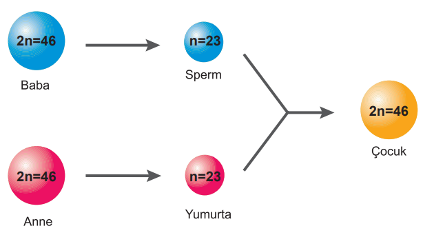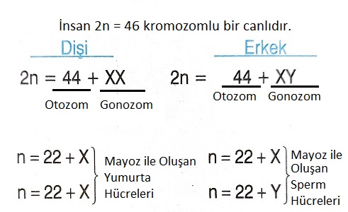 ► İnsan vücut hücrelerinde 2n = 46 kromozom bulunur. Vücut hücrelerinin tamamı ve eşey ana hücreleri 46 kromozom taşır. Ergenlik dönemi ile eşey ana hücreleri mayoz bölünme geçirerek üreme hücrelerini (gamet) oluştururlar. Gametler; erkekte sperm (n = 23 kromozomludur), dişide yumurta (n = 23 kromozomludur) hücreleridir. Bunların döllenmesi ile 2n = 46 kromozomlu zigot oluşur. Zigot yeni oluşan yavrunun ilk hücresidir. Mitoz bölünmeler geçirerek önce embriyoyu sonra yavruyu oluşturur.