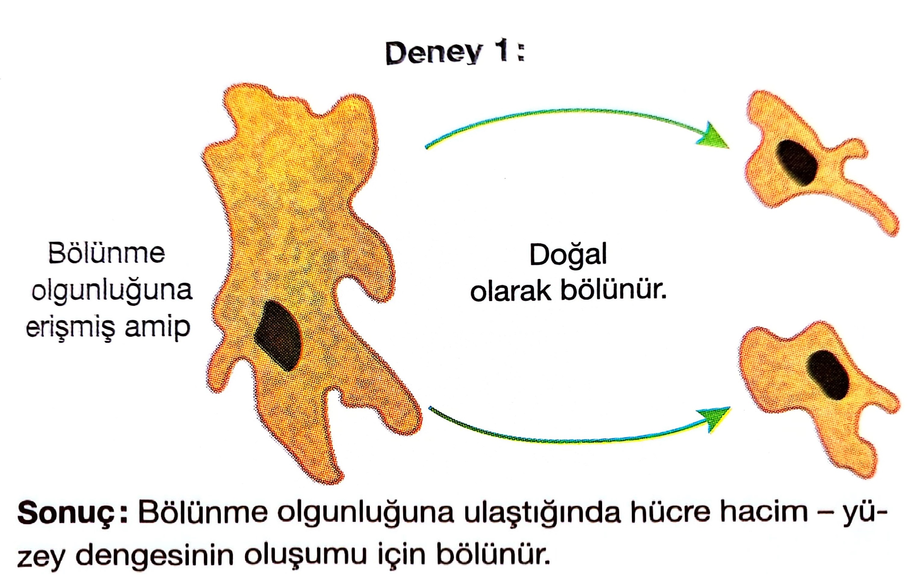 Sonuç olarak hücrede; hacim/yüzey oranı artar. Yüzey/hacim oranı azalır. Bu durumda hücre bölünmek zorunda kalır. |