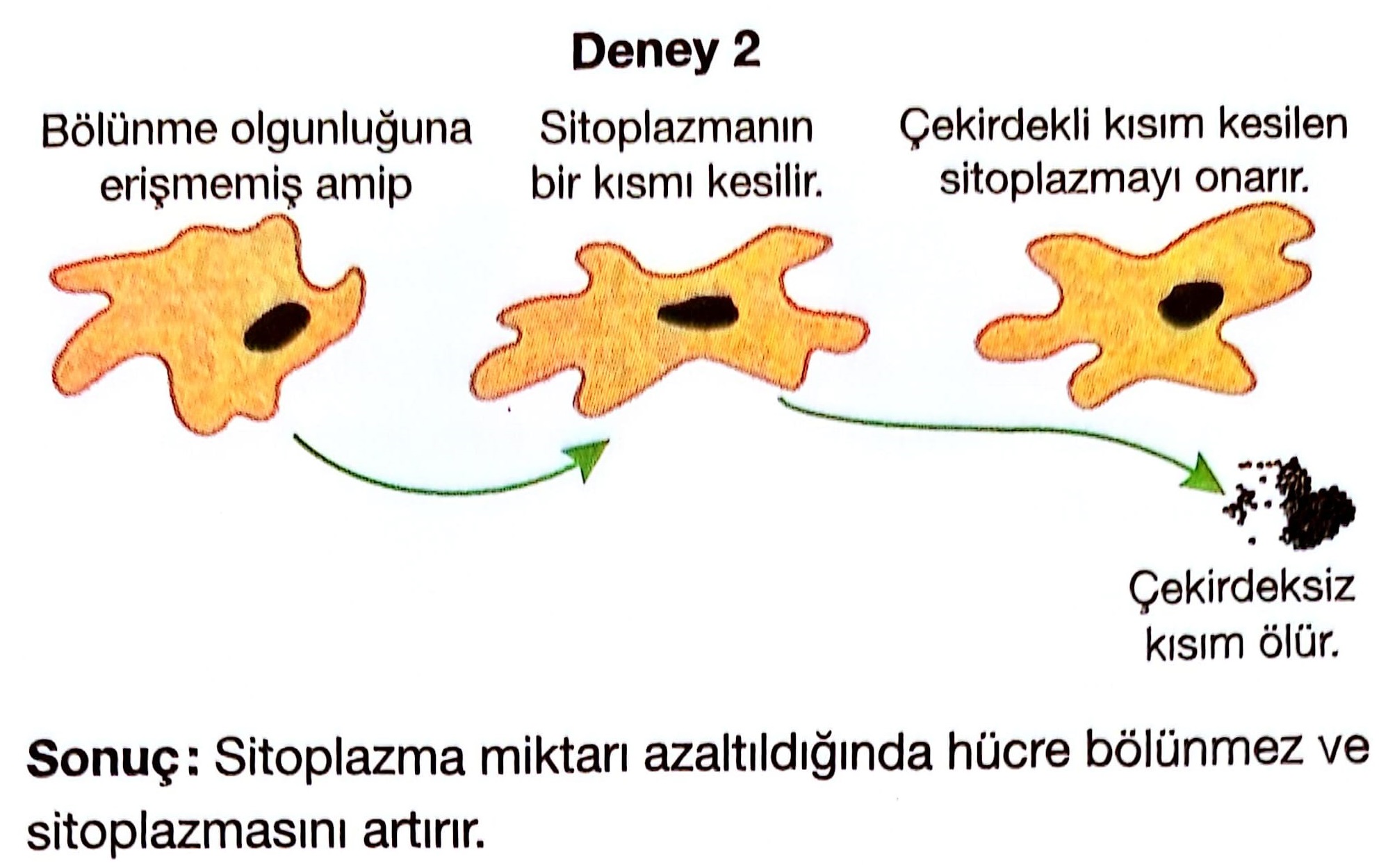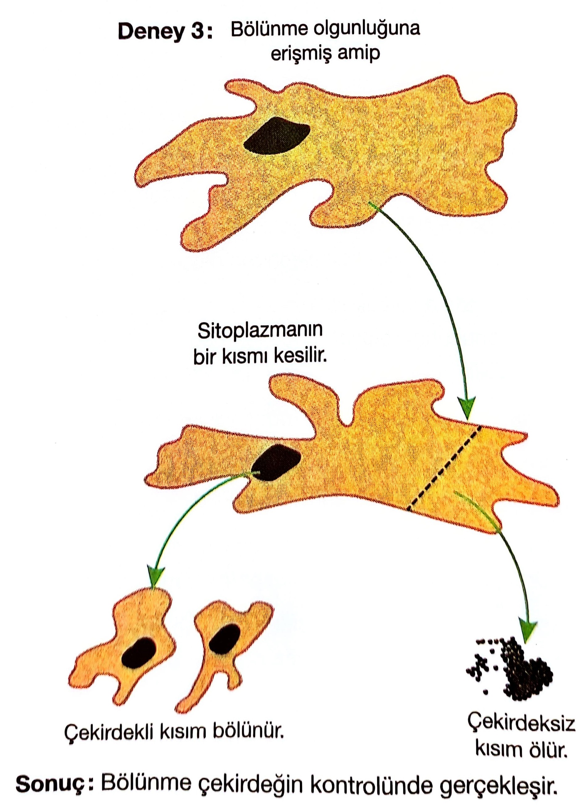 ► Hücre bölünmesinin çekirdeğin denetiminde gerçekleştiğini ispatlamak için amipler üzerinde bazı deneyler yapılmıştır.