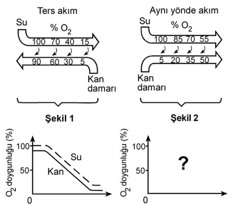 6272Balıkların solungacında kılcal damarlardaki kan akışı ile su akış yönü birbirine terstir. Bu iki ortam arasın- daki oksijen difüzyonu Şekil 1’de şematize edilmiştir. Difüzyon sonunda kanın oksijen doygunluğunda (%) meydana gelen değişimin grafiği de altında verilmiştir.