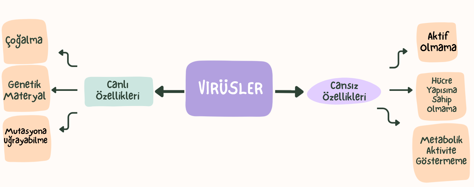 Virüslerin hem canlı hem de cansız özellikler taşıdığı için tam anlamıyla bir kategoriye yerleştirilememesi, bilim dünyasında onları bir sınır varlığı olarak tanımlar. Bu nedenle zihin haritasında, virüslerin hangi yönlerden canlı özellikler gösterdiği ve hangi yönlerden cansız kabul edildikleri net bir şekilde ifade edilmelidir.