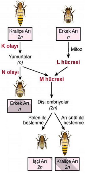 1. Kraliçe Arı (2n): Üremeden sorumludur. Mayoz ile yumurta hücrelerini üretir ve bunları bir kesede depolar. Yılda bir kez çiftleşme uçuşu gerçekleştirir. Erkek arıdan aldığı spermleri vücudundaki başka bir kesede depolar. Bu yumurta hücrelerinden spermle döllenenler dişi embriyoları (2n) oluşturur. Oluşan dişi embriyolar arı sütü ile beslenirse kraliçe arılar, çiçek tozu (polen) ile beslenirse kısır olan işçi arılar (2n) oluşur. Döllenmeden gelişenler ise (partenogenez ile) mitoz ile çoğalarak erkek arıları (n) oluşturur.