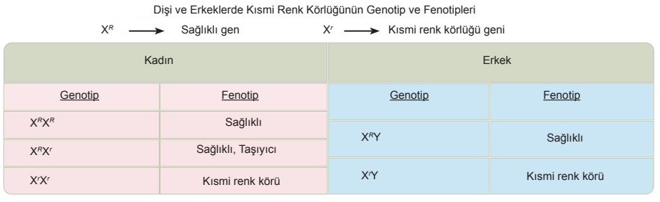► İnsanlarda kırmızı yeşil renk körlüğü açısından dişilerde üç, erkeklerde iki farklı genotipe rastlanır.