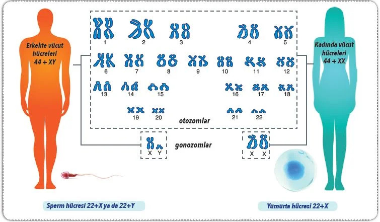 ► İnsanlarda XX kromozomlarına sahip bireyler dişi, XY kromozomlarına sahip bireyler ise erkek olarak gelişir.