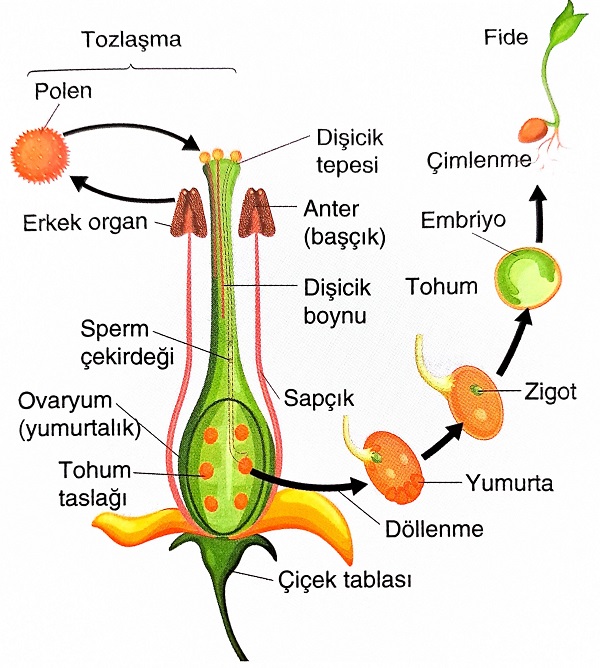 ► Döllenme dişi organın yumurtalığında gerçekleşir. Sperm ile yumurtanın birleşmesiyle zigot oluşur. Zigot mitoz bölünmeler geçirerek önce embriyo sonra yeni bitkiciği oluşturur.