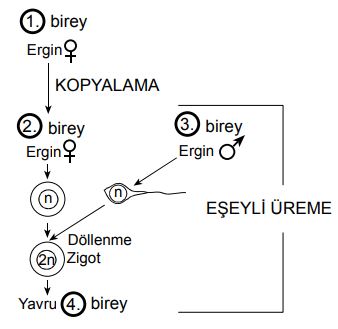 5369Eşeyli üremeyle oluşmuş ergin bir koyundan (1. birey), kopyalama (klonlama) yöntemiyle yavru (2. birey) elde edilmiştir. Aşağıdaki şemada 2. bireyin eşeyli üremesi gösterilmiştir.
