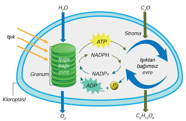 * Işığa bağlı evre–ETS–ATP/NADPH–O₂ zinciri doğru gösterildi.